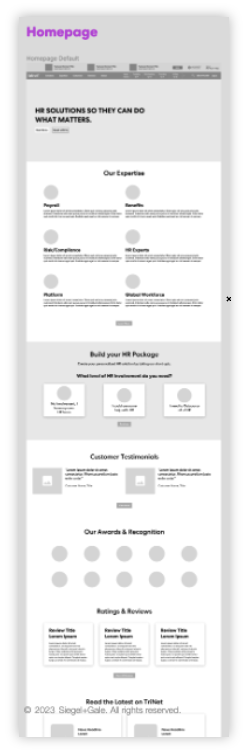 • The project was designed with several critical objectives at its core, aimed at revolutionizing our digital presence. First and foremost, we focused on establishing a scalable and modern web infrastructure, laying the groundwork for future growth and innovation. To streamline the page construction process, we created a system of components based on a molecular framework, enabling automation and efficiency in design. Recognizing the importance of our customers' experiences, we embarked on extensive research to deeply understand their unmet needs. This insight fed into a continuous cycle of testing, iterating, and refining the design, ensuring that each step forward was informed by real user feedback. A significant milestone was the migration of 700 pages of content, which involved not just transferring information, but also repurposing and redesigning it to align with the new brand ethos. Finally, we achieved a groundbreaking integration of Zenefits products and introduced a novel transactional capability into TriNet's website, enhancing our service offering and user engagement.