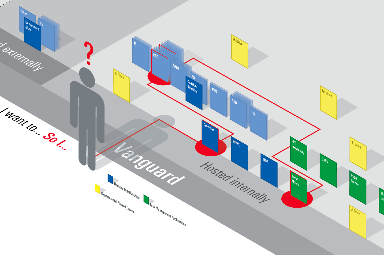This mindset seamlessly translated into my role at Vanguard, especially when tasked with redesigning the company's intranet. Drawing on my packaging design background, I applied a similar philosophy to map out the employee experience, juxtaposing it against the system architecture. This approach allowed for a nuanced understanding of how employees interact with the intranet, identifying the critical touchpoints that could enhance engagement, productivity, and satisfaction. By considering the employee experience as a 'package' that requires thoughtful design to be both functional and meaningful, we were able to reimagine the intranet as a more intuitive, cohesive platform that aligns with users' needs and expectations.